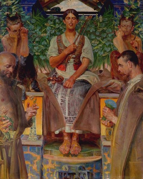 Curator: What strikes you initially about this oil painting, entitled "Wanderer" by Konstantin Korobov? Editor: It's… unsettling. The figures are rendered with such a raw intensity that I feel like I'm intruding on a very private, and possibly dishonest, moment. The lighting is also so dramatic. Curator: Indeed. There's a pronounced chiaroscuro, recalling Baroque drama, although the subject matter—what appears to be a game of chance amongst several individuals—leans toward genre painting, wouldn’t you agree? Consider the social contexts implied by such a scene. Are we looking at exploitation, class differences, or simply leisure? Editor: It’s not just leisure; there’s something deeply predatory here. The central figure’s gaze is piercing, and his hands seem to manipulate the scene—or at least attempt to do so. I'm seeing power dynamics at play. Also, consider the implications of the composition itself: notice how many figures there are relative to how closely they huddle around the card table, which seems very symbolic of a wider exploitation. The figure wearing red in the background especially projects an odd appearance of watching, but not taking part. Who profits from such encounters, and at what cost? Curator: That is a crucial entrypoint, particularly when exploring themes of power, privilege, and social structures embedded within narrative art of this kind. The clothing is suggestive too - are they in disguise? Actors? Nomads? This lends a surreal, theatrical quality to the whole endeavor. It pulls in several influences, wouldn't you agree? Editor: Exactly! The interplay of realism, surrealism, and the implied Baroque influence through its dramatic light-dark contrast. It makes the narrative elusive. It resists simple categorization. I keep thinking about the implications of chance in this situation - who really stands to gain, and why this act feels like it will continue endlessly, creating new wanderers, a group portrait of lost souls. Curator: That's well put. Korobov, through his combination of different artistic approaches, creates an atmosphere that makes the viewers grapple with uncomfortable realities that linger. Editor: Absolutely. It prompts questions rather than providing easy answers, urging us to question who holds the upper hand and what circumstances facilitate such inequitable exchanges. The title, “Wanderer”, gains greater depth in this context too: it represents an ever present issue and situation. Curator: A potent statement that extends beyond mere aesthetic appreciation and calls for deeper investigation. Thank you. Editor: Likewise, a very fruitful analysis.
