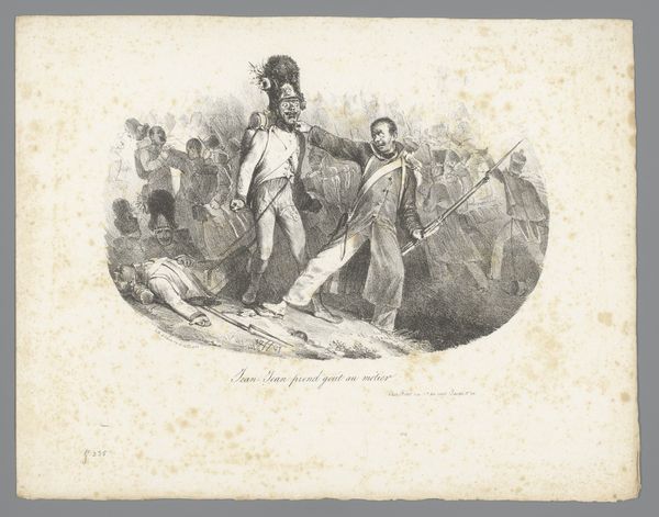 This print, "The Gauls and the Franks," was created by J.J. Grandville in the 19th century, using etching or engraving on paper. Its dense, precise lines are achieved through the careful application of acid to a metal plate, or by manually incising lines into it. Considered a work of graphic art, it comes from a larger context of mass media. The printmaking process allowed for the wide distribution of images. Here, we see its capacity to shape public opinion. The subject – soldiers in battle – connects with the wider social issues of labor, politics, and consumption. Note how much work went into producing this scene, not only in terms of the artistic skill required but also in its reflection on the labor of soldiers in war. By attending to its materials, making, and context, we can appreciate this print not just as an artwork but as a cultural artifact, revealing the intricate relationship between art, society, and the world of labor.