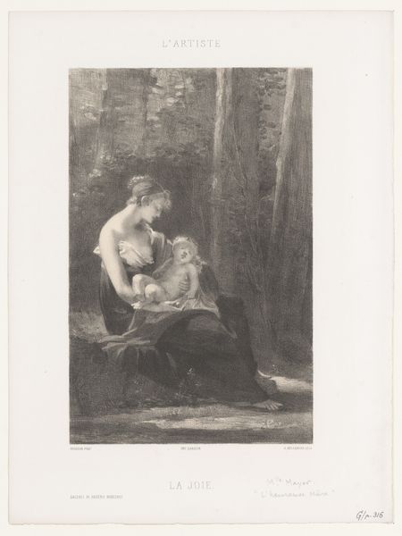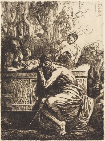 Célestin Nanteuil made this print, "The Fountain," using a technique called lithography. This method allows artists to create images on a flat stone or metal plate, and then transfer them onto paper. Notice the dense, almost velvety blacks achieved through this medium. The velvety blacks define the contours of the figures, the subtle gradations of tone in the surrounding landscape, and the cascading water. Lithography allowed Nanteuil to capture the play of light and shadow, lending the scene a sense of depth and atmosphere. This print belongs to a broader history of experimentation with reproductive technologies in the 19th century. Lithography democratized image-making, enabling the widespread dissemination of art and illustrations beyond the traditional realms of painting and sculpture. This had profound implications for both artistic expression and popular culture. It blurred the lines between original artworks and reproductions, challenging notions of authorship and value in art. Ultimately, "The Fountain" invites us to consider the material and social forces that shape our understanding of art.