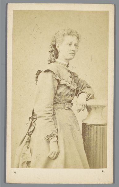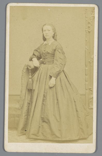 Editor: So, here we have "Portret van een onbekende vrouw," Portrait of an Unknown Woman, taken sometime between 1864 and 1869 by Jan Breebaard, using albumen print photography. There's something strikingly formal about the image, especially the subject's posture. How do you interpret this work? Curator: This portrait encapsulates the visual politics of 19th-century photography. Photography during this period served as a powerful tool for constructing and reinforcing social identities. Breebaard’s subject, despite being ‘unknown’ to us now, adheres to a rigid code of presentation. Note her elaborate dress, which would have signaled specific social status. What do you observe about her gaze, its direction and quality? Editor: It seems direct, almost challenging, but also a little sad, maybe? Curator: Exactly! Her gaze, though seemingly direct, may also betray the societal constraints placed upon women during this era. The act of sitting for a portrait, then, became both an affirmation and negotiation of social standing. Consider how the circulation of these images through family albums or public displays further cemented these visual hierarchies. It served a purpose not merely of memory but as a symbol. Editor: So, the photograph isn't just a representation, but also a performance of identity within those historical constraints. I guess I didn’t fully appreciate the political implications behind these seemingly simple portraits. Curator: Precisely. Recognizing these embedded socio-political dynamics encourages a more critical viewing of historical portraiture, revealing power structures inherent in representation itself. It allows us to question whose stories are being told and how they are being framed, then and now.