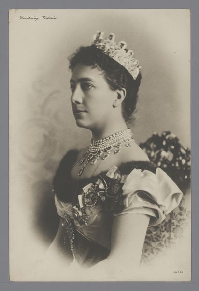 Curator: This photograph, simply titled "H.M. koningin Wilhelmina herdenkingsjaar 1948," a gelatin silver print from 1948, offers a rather formal, intimate portrait. Editor: The grayscale and slightly grainy texture create such a somber yet regal feel. It feels like a quiet acknowledgement, perhaps tinged with melancholy. Curator: The year 1948 is key. After a long reign and the trauma of World War II, Queen Wilhelmina abdicated, handing the throne to her daughter, Juliana. This image became a commemorative object, imbued with cultural meaning tied to leadership and national identity at a pivotal transition. Editor: The tiara, the necklace, the ornate lace sleeves... each object laden with symbolism, a uniform of power passed down through generations. It’s interesting how portraiture, particularly of women in positions of authority, uses such heavily gendered signifiers. Curator: The jewelry and regalia served as visual anchors, reinforcing the monarchy's historical weight. But beyond simple show, these symbols resonated deeply within the cultural memory, conjuring specific moments and qualities associated with Wilhelmina's rule— resilience during the war, commitment to duty. There is some clear modernist sensibility, mixed in this realism, here. Editor: How does the photograph complicate, or perhaps affirm, gender roles in mid-20th century Netherlands? We have a powerful monarch stepping down, ostensibly a moment of progress for women but framed through such rigid, almost archaic symbols of femininity and status. Are these tools that legitimize power, or do they actively confine women within predefined social scripts? Curator: These are important tensions. On one hand, this portrait invokes conventional notions of queenly appearance, which solidify ideas of hierarchy and proper order. But we might ask if Wilhelmina actively weaponized the symbols, if she strategically enacted these visible markers to inspire steadfast confidence among her citizens when it mattered most. Editor: Perhaps these performative elements become complicated gestures, and that’s how their meaning accrues power over time, in ways that can be progressive but also contain a darker, perhaps more oppressive side too. Curator: Precisely. Photographs like these don't just illustrate history, they become potent visual icons, actively shaping our ongoing understanding. Editor: Ultimately, I'm left wondering what Wilhelmina herself thought of it, having to see herself so heavily ornamented. It makes me reflect on what remains of that type of traditional leadership now.