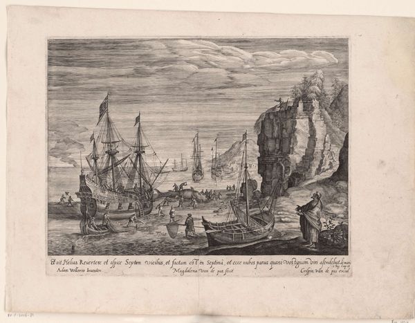 Jacques Philippe Le Bas created this coastal landscape with fishermen using etching techniques sometime in the 18th century. At first glance, one observes the masterful use of line and texture, which are characteristic of Le Bas’ engraving style. The composition divides the scene into distinct zones – the detailed foreground featuring fishermen and rocky outcrops, the middle ground dominated by a ship sailing towards the horizon, and the background, defined by cliffs and sky. The etching technique creates a semiotic interplay, whereby each stroke, and its placement, acts as a signifier. Light and shadow are used to articulate the textures and forms within the image, constructing a complex narrative about man’s relationship with the sea. This piece could be considered an example of how art engages with broader cultural narratives, specifically the depiction of maritime life and industry during the Enlightenment period. Note how the interplay of sharp lines and soft gradations captures not only the physical elements of the scene but also evokes a sense of drama. The enduring allure of this work resides in the artist's ability to render a scene that functions both as a representation of reality and as an evocative exploration of texture and form.