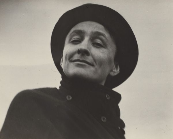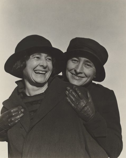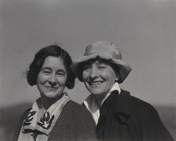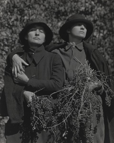 Editor: This striking photograph, "Georgia O'Keeffe and Donald Davidson" from 1924 by Alfred Stieglitz, it’s…well, it’s unexpected! The pairing feels deliberately posed, contrasting O’Keeffe's known persona. How should we interpret this? Curator: What do you notice about the depiction of O’Keeffe, relative to Davidson? Think about their roles as creative individuals within the artistic landscape of the early 20th century. Stieglitz's framing plays into specific narratives. Editor: He presents Davidson, a farmer, literally holding a shovel, close to the earth, while O’Keeffe looks almost regal, yet still outside…almost as if she does not fit this context? Curator: Exactly! Stieglitz, as O’Keeffe's husband and promoter, carefully constructed her image. This photo exists within a larger body of work that solidified her as an iconic figure. This “American” imagery, juxtaposing her and the labourer, reflects the avant-garde interest in the vernacular but simultaneously reinforces societal roles. Are those intentional tensions, you think? Editor: Absolutely! This reinforces her, by contrasting the labour of earth to artistic expression. Are you saying, there is an awareness, on the part of Stieglitz, of creating a brand for his wife and the political role for women? Curator: He’s carefully managing public perception, absolutely. The very act of photographing them together, of displaying it within his galleries, is a deliberate act of cultural positioning. So in what ways, therefore, did this add or take from her achievements? Editor: I see. So it's not just about the subjects, but the photographer's role in shaping their narrative. It almost suggests, through the way O’Keefe is displayed, it adds a regal and posed authority to her. Curator: Precisely. Understanding the historical context—the artistic movements, the social expectations—deepens our appreciation, don't you agree? Editor: It’s amazing how a single photograph can reveal so much about power, perception, and the art world!