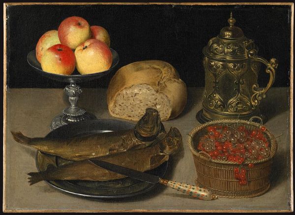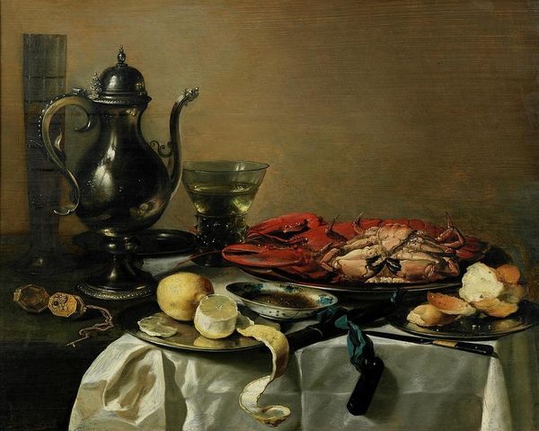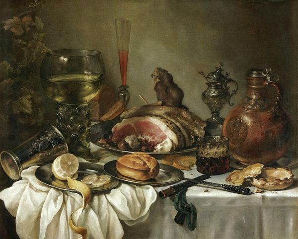 Editor: So, here we have "Still Life with Peacock Pie" by Pieter Claesz. It's an oil painting, and even though it's hard to pin down an exact date, we know Claesz. was part of the Dutch Golden Age. There's something darkly opulent about this table spread. What strikes you most about this piece? Curator: Oh, the sheer theatricality of it all! Claesz is essentially crafting a mini-drama, isn’t he? Look at how light catches the metallic sheen of that ewer versus the matte surface of the pie. It's almost a memento mori, a reminder of our own fleeting existence, elegantly presented in a deceptively delicious package. Don't you think the peacock—such an ostentatious bird, now… well, *pie*—is making a statement about vanity? Editor: I see what you mean! All those luxurious details...almost a bit too much? Curator: Precisely! That tension between abundance and decay. Think about what's implied here. Did someone prepare this feast but then suddenly had to leave? The lemon peel casually draped suggests a passing of time, as does the wilting rose in the peacock's beak. Is it a celebration cut short, a reflection on wealth, or perhaps simply a clever bit of culinary art history? Editor: That's fascinating! It makes me see the painting as more than just a pretty picture; there's a story unfolding. Curator: Indeed! Every element whispers something. The spilled nuts suggesting carelessness or excess... Claesz has an eye that reminds you not just to appreciate beautiful details, but also consider that beyond, they exist inside this fragile painting where things will stay, but, ultimately, *everything* eventually ends. Editor: That's such a great point. It feels like there's so much more to see than meets the eye at first glance. Thanks for your insight!