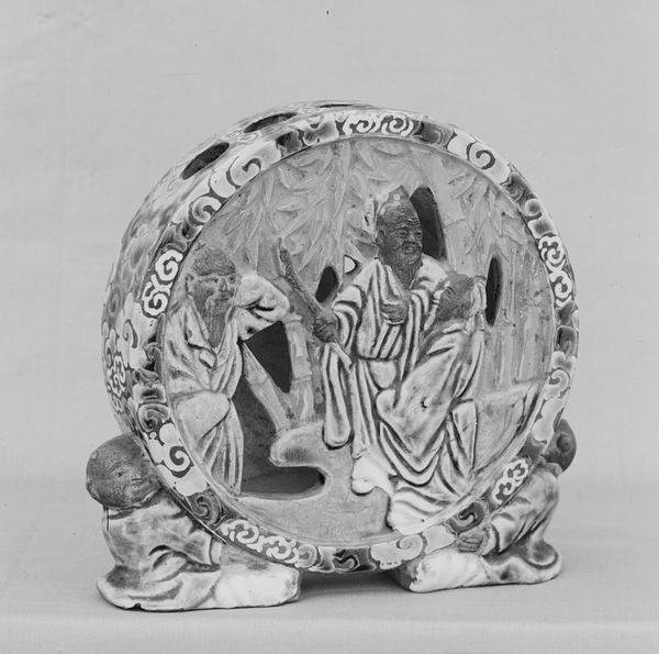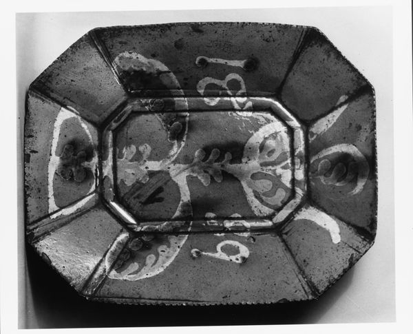Curator: Looking at this photograph of a Moche artifact from ancient Peru, "Dancer's Ornament", one is immediately struck by its layered materiality and suggestion of ritual purpose. Editor: It gives an immediate impression of weight. You can almost feel the heft of the materials, the solidity, but at the same time, a delicacy in the detail of the textile work. There’s a palpable tension between the earthy and the ethereal. Curator: This piece uses mixed media including textiles and what appear to be feathers in its construction. When discussing Indigenous Americas art, especially without a firm date for it, one must acknowledge the power structures that govern museums. The piece is contextualized here, certainly, but the knowledge and culture from which it springs are much larger. Editor: Precisely. And who was this dancer? Was this a symbol of power, a request for rain, or perhaps something far more personal? How do we reckon with the absence of that narrative in a Western museum context? It’s vital to remember that displaying this shifts its meaning from, perhaps, sacred garment to simply "art object," divorced from its ritual purpose. Curator: Absolutely, the layers of appropriation cannot be ignored when understanding the full context, especially because many ancestral remains were seized without proper regard of the people they were taken from. What kind of dance do you think this was intended for? Something solemn, or celebratory? Editor: Definitely processional, something significant. Note the care taken in its craftsmanship; the time dedicated to creating it signifies deep cultural value and underscores the loss when viewed purely as an aesthetic display rather than a cultural and spiritual artifact. We need to address this head-on. Curator: Yes, without knowing the ritualistic purpose it can be easy to essentialize this Moche artifact, losing its cultural complexity in its Western museum display. Editor: Ultimately, acknowledging the interwoven threads of identity, power, and history in this single photograph might give us a more tangible understanding of what’s missing when considering Moche cultural production, and indigenous ancestral art, more generally.