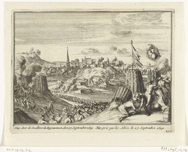 Editor: So, here we have Simon Fokke's engraving, "Watersnood van 1740-1741." It looks like something straight out of a dramatic history book – a chaotic seascape with people desperately trying to survive. What do you make of such a dramatic scene rendered in such detail? Curator: Ah, yes, a tempestuous beauty, isn’t it? You know, I see in this work not just a depiction of disaster, but also a powerful meditation on the relationship between humanity and nature, and how puny we can become in the face of its ferocity. The detailed rendering only enhances that sense of awe, wouldn't you say? Do you notice how the composition draws your eye upwards from the frantic struggles in the water to the dominating sky? Editor: Yes, it's quite striking how the sky seems to press down on everything. It’s almost as if the storm is a character in itself. Curator: Precisely! And Fokke uses this perspective, along with that engraving style, to elevate what would otherwise be just another landscape, into something operatic and symbolic. It speaks to the fragility of existence, maybe even a subtle religious nudge towards repentance or humility? The detail reminds me of those early, exquisitely detailed maps of the world. Were we mapping our fate here, I wonder? Editor: That's fascinating. I hadn't considered the religious aspect. It definitely adds another layer to the piece. Curator: Art, you see, always offers us not just something to look at, but also questions to ponder. Never merely a picture. Editor: This conversation has made me appreciate the power within this tiny image; it's much more than just an illustration of a flood. Curator: Indeed. Now go forth and wrestle with more art...it's character building!