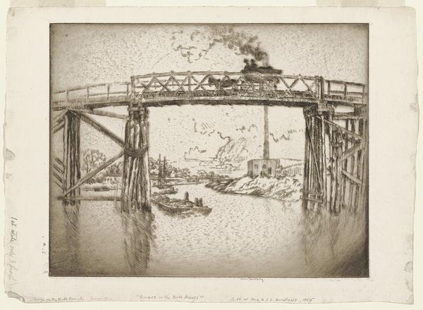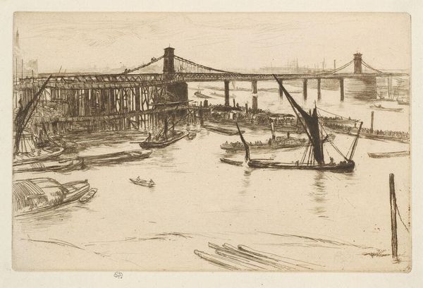 Curator: Whistler's "Old Battersea Bridge," housed at the Harvard Art Museums, presents a striking study in tonal harmony. Editor: It feels fragile, almost dissolving into the mist. The etching seems less about the bridge itself and more about atmosphere, a transient moment. Curator: The bridge becomes a vessel, a symbolic gateway, subtly reflecting a longing for transition and the passage of time. Bridges often carry significant cultural weight. Editor: And look at the process of etching, the way the acid bites into the metal, mirroring the industrial processes transforming London itself! The bridge as a product of labor, of material extraction and construction. Curator: Precisely. The bridge as a symbol of connection, both physical and psychological. Whistler uses a common symbol to explore something deeper, perhaps unconscious. Editor: It's remarkable how the industrial, the material, is filtered through this hazy, almost dreamlike lens. It makes me wonder about the working conditions of the laborers who constructed it. Curator: It leaves us contemplating the ever-present dialogue between permanence and change, the tangible and the ethereal. Editor: A bridge not just of steel and timber, but also of fleeting impressions. Very interesting.