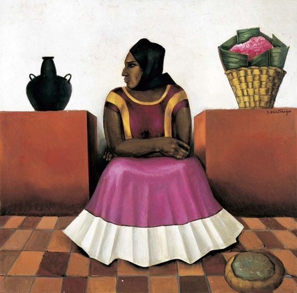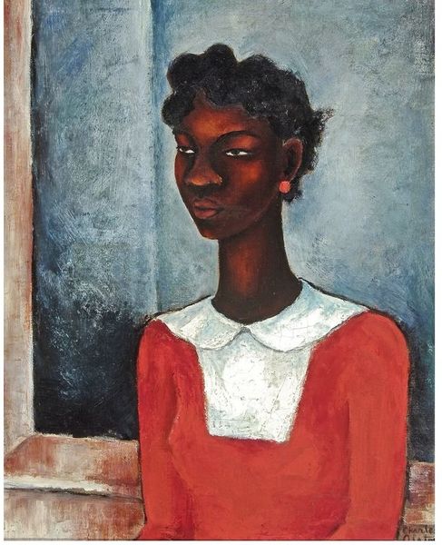 Curator: Diego Rivera painted this portrait of Lupe Marín in 1938, while the two were no longer married. It’s now housed here at the Museo de Arte Moderno in Mexico City. Editor: What strikes me first is the interplay of lines—the verticality of the window frame against the flowing curves of her dress. It's almost architectural, but with this soft, human counterpoint. Curator: Absolutely. Rivera positions Lupe, his second wife, as a figure deeply enmeshed in Mexican society, but also constrained by its traditions. Note the traditional Tehuana dress, while appearing pure, almost bridal, carries implications about gender roles. Editor: And yet, there's a boldness in her gaze. Direct, almost defiant. Is that softened at all by the subtle reflection behind her shoulder, providing us with a shadow of the sitter as a support or reminder of context. Curator: Rivera always saw art as a tool for social change. The painting comes at a time of huge societal upheaval, and Lupe, known for her fierce independence, becomes a symbol of female strength during the Mexican revolution and thereafter. The bold composition is certainly meant to make that evident to viewers in its presentation, especially since she looks so direct and assertive in the presentation.. Editor: Technically, you'll note the painting uses a restrained color palette, almost muted. It lends a kind of classical sensibility. This calm creates an interplay of planes that add to that strong sense of three-dimensionality which is especially interesting in the space within and outside of her form Curator: Considering her position as an intellectual, an actor, and the writer as muse, this is not some generic portrait—Lupe is part of an evolving modern Mexico with new social dynamics. This presentation would signal that very clearly in artistic circles as part of his movement. Editor: The simplicity of form is really doing all the work here though. If the image were busier and ornate, then the subject might be obscured..but there she is, the embodiment of all those issues in one concentrated image. It truly captures its core ideas so effectively. Curator: Rivera created a potent image of the period using Lupe. The work presents not just Lupe, but represents the new ideas for Mexico with the modern revolutionary woman standing powerfully at its center. Editor: In essence, we have a sophisticated engagement with form and ideology, making it far more than just a beautiful portrait, I now understand how deeply this ties in!