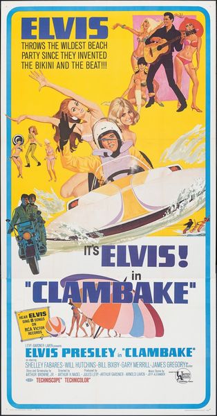 Editor: This is "Live a Little, Love a Little", the movie poster from 1968 featuring Elvis Presley, I guess created using photography and graphic design techniques. The image strikes me as so…over the top! Elvis surrounded by women in bikinis. What's your take on it? Curator: Well, let's start with context. 1968 was a turbulent year of social and political upheaval. This poster offers an almost aggressively shallow vision of freedom, right? It pushes back against those complexities, suggesting carefree fun. How does this imagery perpetuate, or perhaps challenge, gender roles of the time? Editor: I see what you mean. It feels very objectifying, the way the women are presented. But could it also be seen as women embracing their sexuality? Curator: That's a great question. The poster reflects a specific fantasy, primarily from a male perspective. But we can ask ourselves: could these images be read in a different light, highlighting agency rather than passive objectification? Who exactly gets to 'live a little' in this picture, and at what cost? Editor: I hadn't considered that before, how power dynamics influence even seemingly innocent images. It's definitely more complex than just "Elvis having fun." Curator: Exactly! Analyzing the image in its historical and cultural context reveals the societal undercurrents related to power, sexuality, and the male gaze that are subtly yet powerfully at play. Editor: Wow, I'll never look at an Elvis poster the same way again! Thank you, this has given me a lot to think about.