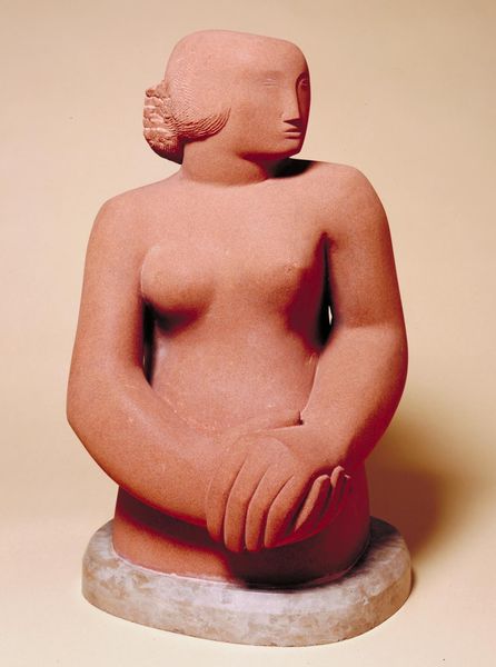 Editor: So, this is Eric Gill's "Eve," a stone sculpture at the Tate. It feels…submissive? Almost ashamed. What's your take? Curator: It's interesting you pick up on that sense of shame. Gill was deeply religious and his work often grapples with the tension between sensuality and spirituality, particularly within the female form. Consider how ideas around female sexuality were policed during his lifetime, and how those power dynamics may be at play here. Editor: So, is this a commentary on the objectification of women, even in religious contexts? Curator: Precisely. Gill's personal life was complicated, even controversial. Can we separate the art from the artist here, and what does it tell us about the male gaze and its historical impact? Editor: That gives me a lot to think about – the sculpture as both a religious figure and a representation of societal pressures on women. Curator: Exactly. It's a potent reminder of the lasting influence of historical power dynamics on art and our understanding of it.