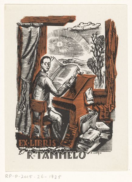 Jean Emile Laboureur made this print of the collector Alphonse Lotz-Brissonneau, using wood engraving techniques. This was a popular medium in the early 20th century, particularly among artists interested in accessible art. We can see a man examining a print, surrounded by shelves and boxes filled with artworks, suggesting the subject's profession as an art collector. Made in France, this print provides insight into the culture of art collecting and connoisseurship that was emerging at the time. Laboureur’s style is influenced by cubism but is also reminiscent of the Arts and Crafts Movement, seen in the geometric border, reflecting a desire to integrate art into everyday life. This piece not only portrays an individual, but it also speaks to the networks of art production, patronage and artistic taste in interwar France. To understand the social and institutional context of the work, it is worth exploring exhibition catalogues, biographies of collectors, and critical reviews in art journals from this period.