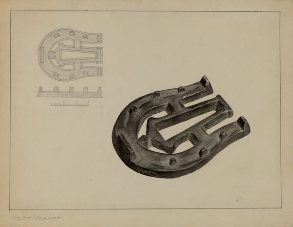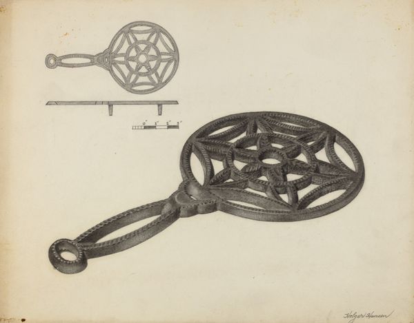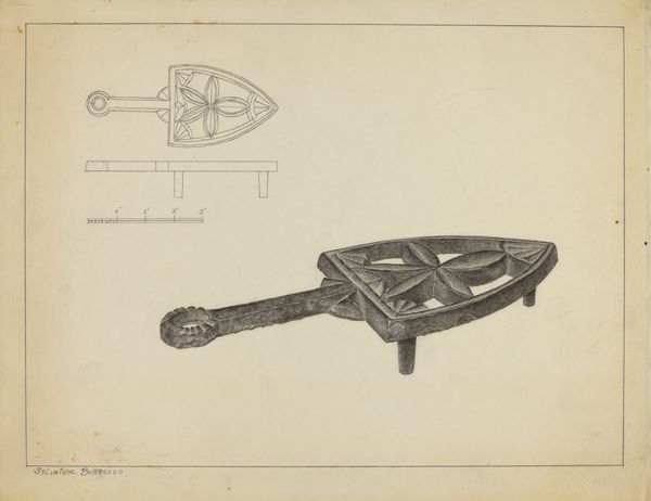 This drawing of a Flat Iron Holder was made by Salvatore Borrazzo, but when? It's a mystery. It's rendered with precise lines, mostly monochrome, and it presents us with a functional object elevated to something more. The drawing has a mechanical feel to it, a sort of technical rendering, yet the object itself is far from cold; it’s ornate, decorative, almost ceremonial. Look at the way Borrazzo delineates the heart shape, and then the triangle within it, the lettering, the star – all those symbols loaded with meaning, rendered so carefully. I’m intrigued by the shadows that give it dimension, the way the object seems to float on the page. It reminds me a little of some of the Shaker gift drawings, a utilitarian object imbued with a sense of the spiritual. Ultimately, art is like that, isn't it? Taking something ordinary and making you see it in a totally new light.