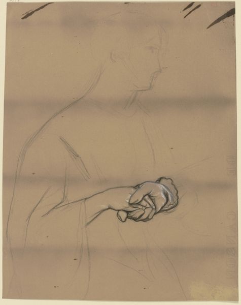 Curator: Here we have Cornelis Vreedenburgh’s "Figuur met een opgeheven rechterhand" from between 1890 and 1946. It’s an ink drawing, a seemingly quick sketch. What do you make of it? Editor: It feels so fleeting! Like catching a thought mid-flight. The raised hand—it could be pointing, blessing, maybe even warding something off. It's wonderfully ambiguous, yet insistent. Curator: That gesture, the raised hand, has such a rich history. Think of classical rhetoric, where specific hand gestures conveyed distinct meanings, intended to persuade and move audiences. It’s a primal form of communication. Editor: It reminds me of courtroom dramas! All that dramatic pointing and emphatic gestures... But here, stripped down to these sparse lines, it's become something almost mystical, don't you think? A solitary figure captured in a moment of revelation, perhaps? Curator: Vreedenburgh may well have been exploring a particular concept here, rather than depicting a literal scene. Gesture in art has often signified power, authority, or divine intervention. Editor: Absolutely. The figure’s turned in profile, too, so it’s kind of distant and unknown, as if its message isn’t really for us, you know? A secret between the figure and... what exactly? That blank space on the page feels huge. Curator: A "personal sketchbook" tag has been assigned to it, suggesting it may be a very initial draft, maybe even a part of planning of some bigger project of the artist, it seems more a reflection of the artist’s own thinking and exploration than a pronouncement to the outside world. Editor: Maybe Vreedenburgh was just having a really good idea and was afraid of forgetting it! The purest, simplest act of capturing a vision. Curator: It leaves you pondering the weight of a single gesture, doesn't it? So simple, and yet it holds so much potential meaning, still captivating after all this time. Editor: Exactly! It’s a little spark. It’s lovely how something so incomplete can ignite so much curiosity. A reminder of the magic in beginnings.