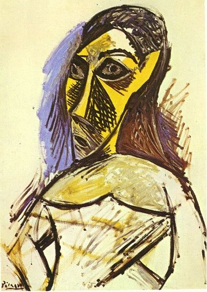 Editor: Here we have Arshile Gorky’s 1936 oil painting, *Woman with Necklace Marquette*. There's something really raw and unsettling about it. What strikes you most about its visual language? Curator: The tension is palpable. The color choices create a dissonant harmony: the pale lilac backdrop against the vibrant yellows and oranges. Note how the brushstrokes, applied with considerable impasto, don’t merely depict the subject but actively construct it. It’s about surface, texture, and the materiality of paint itself. Does the composition resonate with you in particular ways? Editor: I think so. It's the lack of smooth transitions and the unfinished feel of certain areas. Curator: Precisely. The fragmented appearance and clashing of forms work against any sense of classical beauty or resolution. Look closely at the face—how Gorky has reduced it to a series of planes and abrupt angles. One could apply structuralist principles, observing how the binaries – finished/unfinished, representation/abstraction – create a visual grammar that subverts conventional portraiture. What impact does that grammar have on your experience of the work? Editor: I see. It's like he’s deconstructing the idea of portraiture to get at something deeper. More emotional, maybe? Curator: Possibly. It is through such deliberate manipulation of form that the artist compels us to question our expectations. Semiotically, the necklace itself takes on added weight, standing perhaps for societal constraint or the illusion of beauty. What final thoughts might you share? Editor: I didn’t realize how much the application of paint itself contributed to the feeling the painting evokes. Thanks for pointing out those details! Curator: Indeed, attending to these elements reveals the core of the work's aesthetic and affective power.