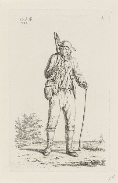 Joannes Pieter Visser Bender created this etching, "Man met steek op het hoofd," sometime before his death in 1813. The image presents a figure wearing a bicorne, a type of hat widely associated with military and naval uniforms in the late 18th and early 19th centuries. Produced during the Netherlands’ period of French rule, the artwork participates in a visual culture shaped by the Napoleonic Empire. The figure's attire, stance, and the presence of what seem to be bullets on the ground evoke the militaristic atmosphere of the time, reflecting the social conditions marked by war and conscription. Further research into the artist’s life, the etching's production context, and the iconography of military dress during the Napoleonic era will clarify the meaning of this image, highlighting how art serves as a mirror to its socio-political world.