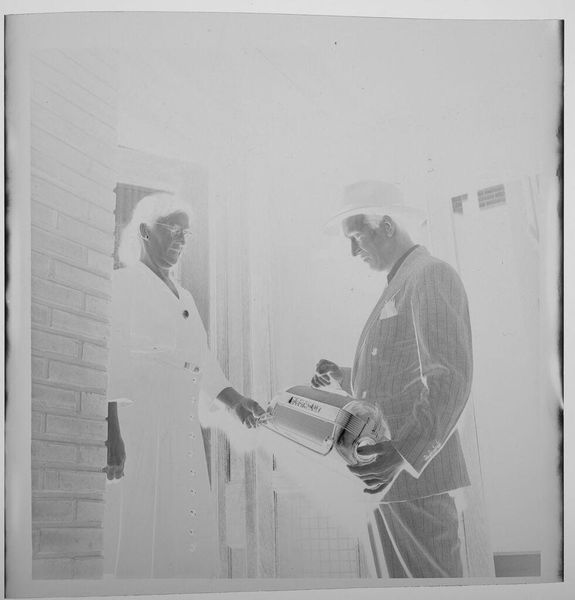 Curator: This diminutive gelatin silver print, currently titled "Untitled (two men in front of staircase)," comes to us from the hand of Jack Gould. There's an almost theatrical stillness about it, wouldn’t you agree? Editor: Absolutely. The stark contrasts and the men's attire evoke a sense of formality and perhaps a hint of mystery. The cigarette being lit seems like a charged moment. Curator: Indeed. The composition itself is quite striking. The receding staircase creates a strong diagonal, countered by the verticality of the two figures. The stark tonal range emphasizes the geometric interplay of light and shadow. Editor: I see echoes of societal ritual and status, almost a symbolic passing of something between the men. The staircase, always a symbol of ascension, feels almost like a stage for their interaction. Curator: An interesting interpretation! For me, the photograph's power resides in its formal elegance, the balance of shapes, and the manipulation of tone to create depth and intrigue. Editor: Well, for me, it's how it resonates with our collective memory of social dynamics and unspoken hierarchies. A fascinating piece to consider. Curator: A captivating study in form and light, leaving much open to interpretation.