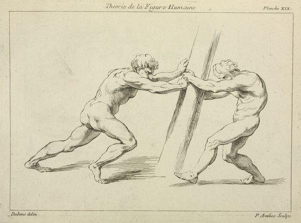 Peter Paul Rubens created this drawing, Studies of two figures pushing against a pillar, using pen and ink. Rubens was a leading figure in the Flemish Baroque style, a movement that placed great emphasis on the perfection of the human form. Rubens’s drawings were often part of a larger workshop practice, where they would have been used to educate artists in the studio. Here, the artist displays a technical understanding of the body in motion. The two central figures push against a large pillar, their muscles tensing and straining, while studies of arms below explore the dynamics of anatomy. The engraving presents this work as part of a numbered collection, giving the image the status of a scientific investigation, as seen in the inscription at the top of the image "Theorie de la Figure Humaine." To understand these images, we can consult handbooks and model books that would have been in circulation at the time. We may also want to consider the politics of the European courts, where many artists were employed in the creation of dynastic portraits.