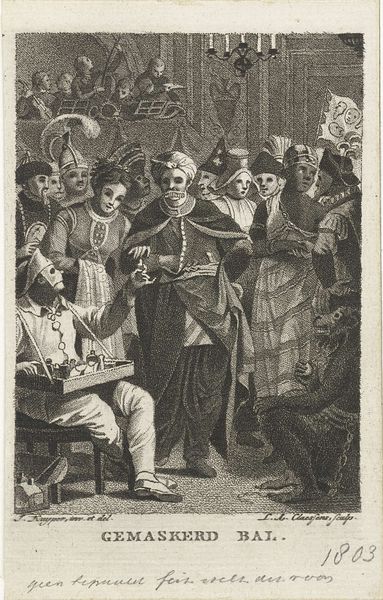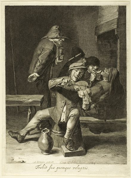Curator: We’re looking at Cornelis Dusart’s “Oktober,” an etching dating from 1679 to 1704, held at the Rijksmuseum. What strikes you first about it? Editor: It's incredibly textured! The layers of shading give it such depth. You can almost smell the musty cellar depicted, full of drinking and merry-making. It makes you think about the conditions required to even produce wine! Curator: Exactly. Dusart’s technical skill is quite impressive here. The density of the etching lines communicates the heavy, rustic atmosphere. It also hints at the division of labor inherent in wine production and consumption in Dutch society at the time. Editor: This makes you consider who would have been producing wine at this period in Dutch history, and who might have had the power to commission a print such as this? Was this sort of subject matter common or unusual? Curator: Genre paintings showing daily life became fashionable. Think of it, prints like these circulated widely. This imagery would likely appeal to those rising merchants keen to celebrate Dutch commerce. Editor: Notice also that it features grapes hanging from the cellar ceiling! Are those real or purely decorative? Do we even care? It is such a rich cultural marker! These aren't refined aristocrats – it's the jovial atmosphere of the lower to middle classes presented and made palatable. Curator: Well, what it demonstrates is the material conditions around that specific social environment; it hints to us about class aspirations that go hand in hand with the print. Editor: Right, we're dealing with how such displays shape identity and create social perceptions about a time that’s very different than ours. This slice-of-life image serves both as art and as a social artifact reflecting societal values. Curator: Thinking about Dusart's role and his skill, it’s very obvious that he understood and masterfully communicated his patron's sensibilities. Editor: Ultimately, examining its form offers us such insightful keys, to what the 17th-century Dutch perceived their society, through both production and appreciation.