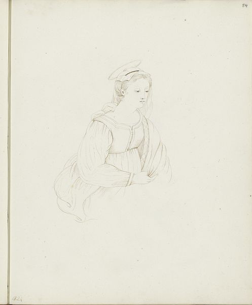 Curator: Looking at "Seated Woman in a Mourning Attitude," a pencil drawing from 1821 by jonkvrouw Elisabeth Kemper, what strikes you most? Editor: An overwhelming feeling of lassitude. Her very posture speaks of weariness; it’s as if her own weight is too much to bear. The way her head rests on her hand—a classical gesture, certainly—but here it feels raw, unvarnished. Curator: Absolutely, and Kemper manages to convey this with such economical means. There's a Neoclassical air to the flowing drapery and the sitter's idealized features, echoing earlier artistic conventions. But then you notice the sketch-like quality, a sense of immediacy, that cuts through any idealization. The slight asymmetry, the unfinished areas—it suggests something much more intimate and personal. Editor: You know, those 'imperfections,' if you can even call them that, are where the power lies. It transforms her from a distant goddess to a woman caught in a moment of intense emotion. The chair, a symbol of authority and stability, becomes a mere prop, unable to offer solace. I’m immediately thinking about themes of mourning and personal grief—or the cultural symbols attached to suffering. Curator: It’s interesting how you latch onto those signs because, personally, it evokes a sense of the artist exploring an idea, not necessarily a definitive representation. Maybe it’s the inherent nature of a sketch that gives the drawing an ethereal quality. It exists between a thought and a fully formed piece. Editor: Perhaps, but even an initial thought can hold immense symbolic weight. Consider how the downcast eyes, a universal signifier of sorrow, connect us across time. And think about how the pose—hand supporting head—has been used for centuries to represent melancholy. Kemper taps into a deep well of cultural memory, intentional or not. Curator: A fascinating point. It highlights how even what we perceive as spontaneous and heartfelt expressions often have roots in visual traditions. Even while the artist might have been striving to capture something ephemeral, something in the here-and-now. Editor: And that tension—between personal experience and inherited visual language—is precisely what makes this sketch so compelling, isn’t it? Curator: Precisely!