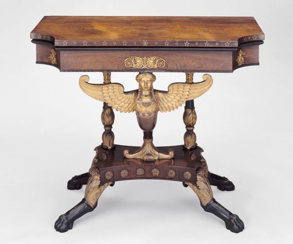Curator: This ornate table, created by Jan van Mekeren around 1695 to 1710, offers an intriguing look into the stylistic tastes of the late 17th and early 18th centuries. Editor: It’s rather somber, isn't it? The dark wood dominates, yet there's an attempt to alleviate the austerity through the floral inlays. I find myself drawn to its quiet formality. Curator: Indeed. Notice how the artisan uses the wood's inherent grain and color as key elements of the overall design. The dark panels are juxtaposed against lighter edges and floral detailing, creating contrast and rhythm. Editor: The floral imagery seems directly tied to themes of growth, prosperity, and the bounty of nature that were frequently used in Dutch art. The inclusion of the flowers almost feels talismanic, evoking ideas of health and well-being for the home it occupied. Curator: Exactly, the arrangement and style of the inlays indicate an emphasis on craftsmanship. Look closely and you will see the level of precision and care, indicating considerable skill. The design suggests both formality and a conscious organization of surface planes. Editor: Considering the period, the darkness and the density of the applied floral motif may speak to cultural anxieties, or the ephemeral nature of life's joys in a world shadowed by uncertainty and plague. Curator: An interesting perspective. Whether that darkness reflects anxieties, the careful balance of light and shadow is a clever aspect of this piece's visual construction. Editor: By recognizing how Van Mekeren incorporated symbolic weight and detail into a functional object, we can glimpse aspects of their belief system and broader culture. Curator: Ultimately, examining elements such as its careful structure enables a much better understanding of this artist and this historical moment. Editor: Agreed. This dialogue reminds us how household objects can tell us such rich histories if we stop and consider how it speaks, not only materially but symbolically.