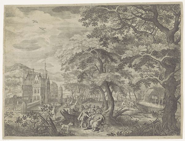 Jan van Londerseel created this landscape etching with the Parable of the Workers in the Vineyard around the early 17th century. The composition is immediately striking in its organization of space. Londerseel divides the image into distinct zones, from the foreground figures to the expansive middle ground and the distant architecture. The formal arrangement serves a didactic purpose, illustrating the biblical parable through spatial and relational cues. The artist uses light and shadow to guide the viewer’s eye. Look closely at the way Londerseel employs line and texture. The trees, with their meticulously rendered leaves, contrast with the smoother treatment of the sky and distant buildings. The artist seems to want to create a sense of depth and atmosphere. The very act of placing a biblical scene within such a detailed landscape blurs the lines between the sacred and the secular, inviting viewers to find religious meaning in the natural world. This etching is not merely an illustration; it’s an invitation to contemplate the convergence of the divine and the everyday, mediated through the careful arrangement of form and space.