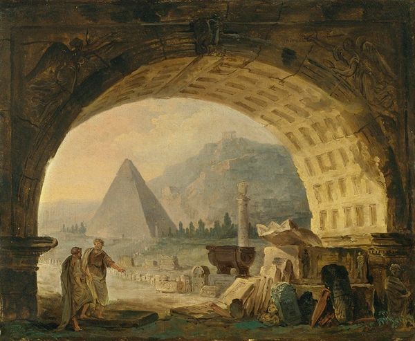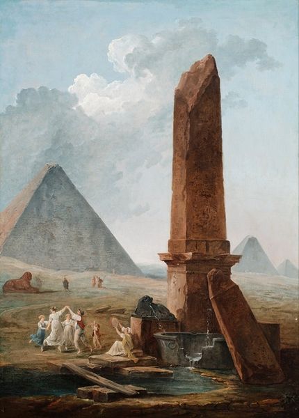 Hubert Robert painted this oil on canvas, "Landscape with soldiers and a pyramid," during a time when Europe was captivated by antiquity, yet also on the brink of revolutionary change. Robert's architectural fantasies often juxtapose the grandeur of classical ruins with scenes of everyday life. Here, soldiers lounge amidst decaying monuments, while a pyramid looms in the background, evoking the exoticism of distant lands, and sparking reflections on the rise and fall of civilizations. How might these soldiers relate to the crumbling structures around them? Are they guardians, plunderers, or simply passersby in a landscape of forgotten empires? Robert himself experienced a period of imprisonment during the French Revolution. Perhaps this personal history instilled in him a heightened sensitivity to the precariousness of power and the transience of human endeavor. This painting is a subtle meditation on history, memory, and the complex relationship between the past and present, inviting us to contemplate our place within the vast sweep of time.
