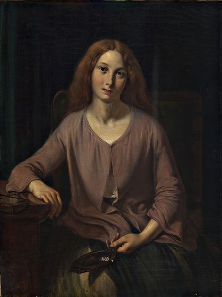 Curator: Alfred Stevens painted "Mary Ann, Wife of Leonard Collman," a portrait rendered in oil on canvas, now residing here at the Tate. Editor: The somber tonality and the subject's averted gaze create a sense of introspection. Curator: Stevens was highly regarded for his ability to synthesize classical ideals with a modern sensibility. Consider the sitter's dress; it hints at the Victorian era, while her pose and the painting's composition have Renaissance echoes. Editor: Absolutely. The setting and dress also reflect the social norms of the era, where women were often portrayed as demure and contemplative. Her position in society is clearly defined. Curator: Observe how Stevens uses light and shadow to sculpt her face, drawing the viewer's eye to her expression. The interplay of light across her skin and the detailed rendering of her hair further emphasize the painter's skill. Editor: Yes, Stevens does subtly comment on the role of women in society and art. Curator: A fascinating piece demonstrating a dialogue between tradition and emerging social currents. Editor: Indeed, Stevens captured a moment of quiet dignity, reflecting the era's complex portraiture.