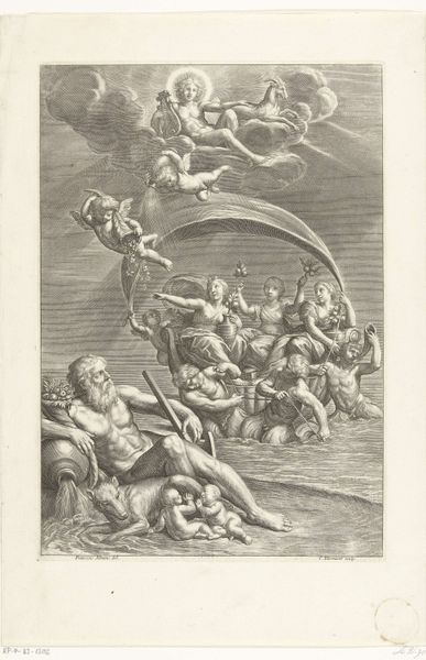 Curator: This is the "Dispuut over het Heilige Sacrament," the right half, created around 1552 by Giorgio Ghisi. It’s an engraving, currently held here at the Rijksmuseum. Editor: Wow. It’s... intensely detailed. Like a celestial courtroom drama playing out across different planes of reality. And a very elaborate pattern of a floor. It looks dizzying, in a way, because everything competes for attention. Curator: It is. Ghisi was a master engraver, and this piece showcases the Mannerist style prevalent at the time. Think about the reproductive function of prints; the engraving process allowed for wider dissemination of complex theological arguments and visually impressive compositions. The physical act of producing such intricate detail would have been a laborious, time-consuming endeavor. Editor: I imagine! You can almost feel the pressure he must have felt pushing that tool to recreate this scene on metal. So much concentrated energy... Is this some sort of allegory then? I am attracted by these groups of characters sitting on what looks like celestial clouds. Curator: Absolutely. The Disputation depicts theological debates around the Eucharist, staged between earthly and heavenly figures. Consider how prints facilitated not only the spread of imagery but the propagation of specific doctrines and world views tied to powerful religious factions of that moment. Editor: It makes you think about the power of images, right? Especially in times of theological upheaval, a carefully crafted piece like this could sway opinions as powerfully as any sermon. And look, that texture above! Did the engraving support new approaches in portraying the light and its nuances? I wonder about these puffy, busy clouds… they seem to overwhelm everything. Curator: The Mannerist aesthetic favored complex compositions and idealized forms. What strikes me is how Ghisi used engraving to translate painterly effects onto paper, playing with tonal gradations. Each line, each dot, serves the didactic, aesthetic function of the artwork. Editor: There is such dedication of labor that seems unreal today! To have poured weeks, months into capturing such detail—it speaks volumes about the perceived importance of both the subject and the act of making itself. I am so impressed! Curator: Precisely! These prints became valuable commodities that circulated throughout Europe, shaping beliefs. This specific print allows us to contemplate not only religious art of the time but also economic structures surrounding art making and circulation. Editor: That adds another layer to the intensity, doesn’t it? Knowing it was made with that specific purpose... Still, looking at this piece now, divorced from its original context, it strikes me as both a testament to skill and a curious window into a very different world. I appreciate having learned more about the circumstances that lead to its making.