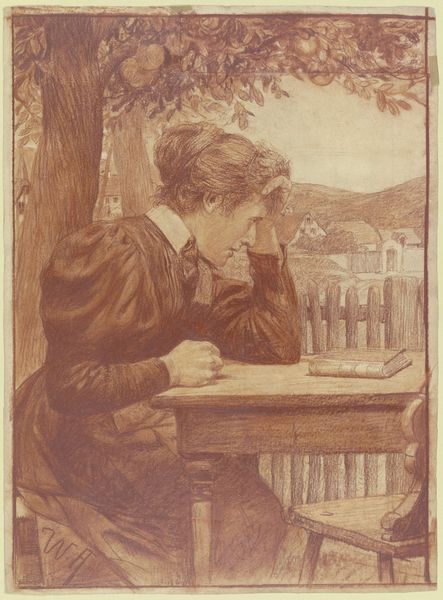 Curator: Looking at this artwork, titled "Dream Blocks" by Jessie Willcox Smith, I'm immediately drawn to its pensive mood. It's an evocative watercolor piece featuring a child perched on a windowsill, gazing outward. There’s a gentle, almost wistful quality to the scene. Editor: Absolutely, it's easy to read that sense of longing, isn’t it? The artist's focus on childhood, particularly girlhood, resonates within larger social narratives about the sentimental idealization of children during this era. Look at how the open window could be read as symbolic of the limited freedom afforded to young women in certain social contexts, and the outdoors might be suggestive of opportunity beyond the domestic space. Curator: I agree. I think what Smith does well is blend a surface-level sweetness with something deeper, more ambivalent. Smith was prolific as an illustrator during what's come to be known as the Golden Age of American Illustration, but "Dream Blocks" has a particularly haunting effect for me, beyond pure illustration. Editor: Exactly. The alphabet blocks arranged at the child's side spell out the words "LADS DOM," and the rest remains ambiguous. Is it "Lads Dominate"? What are your thoughts on this? It is a commentary about gender? We have to analyze the cultural backdrop against which Smith was producing her art: a period of increasing female empowerment concurrent with anxiety around the shifting patriarchal structures. What were the dominant views on the education of young children, and what role did literature and visual art play in the reinforcement—or subversion—of these dominant narratives? Curator: Fascinating. Beyond that social reading, what also captivates me is the quality of the light—that silvery wash. You get the sense of a very specific time of day and year, even without precise details. Smith manages to make something rather everyday seem quite magical, full of untold possibility and untapped creativity. It is really the subtlety of the palette that gives us all this. Editor: Indeed. We can see the ways in which historical perspectives can offer insights into not just what’s shown in “Dream Blocks," but how those choices connect with issues of gender, agency, and representation within and beyond the picture frame. The work invites us to reflect on what it means to see the world, but also to consider who gets to shape that vision, and under what terms.