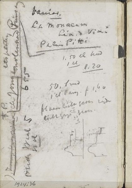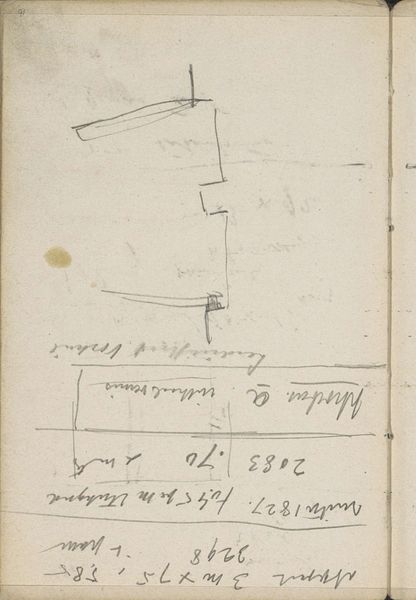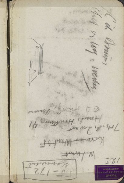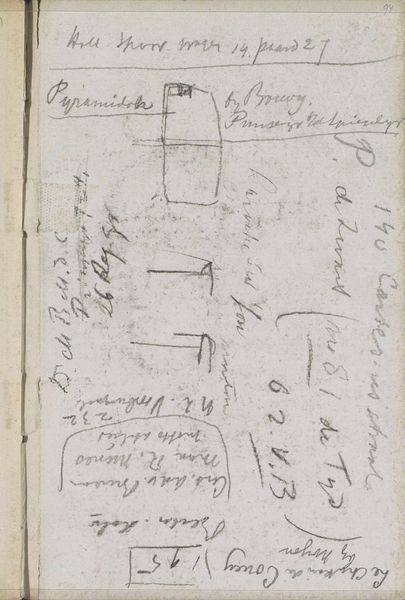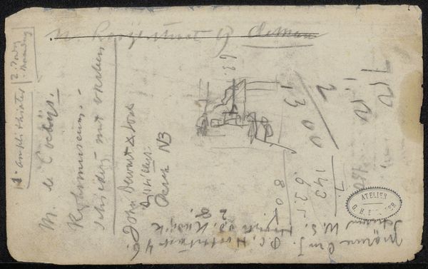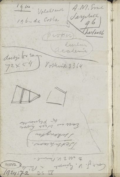 Curator: Welcome. We’re looking at Cornelis Vreedenburgh’s "Notities," created sometime between 1890 and 1946. It's a mixed-media drawing with pencil on paper, currently held in the Rijksmuseum collection. Editor: It appears to be a page torn from a sketchbook, filled with what looks like handwritten notes and calculations, perhaps architectural in nature? What immediately strikes me is its fragmentary, almost chaotic composition. What catches your eye, viewing it from a formalist perspective? Curator: Indeed. What intrigues me most is the interplay between the disparate textual elements. Observe how the various scripts—some cursive, others more technical—create a dynamic surface. Notice also the contrasting weights of the lines, shifting from delicate, almost ephemeral marks to darker, more assertive strokes. Consider how the placement of each inscription relates to the other – do they create a harmonious composition? Editor: I see what you mean. The variation definitely creates visual interest, preventing it from feeling like just a collection of notes. It's like the artist is creating a landscape of text. Is the medium of the paper significant? Curator: The paper acts as both a ground and an active element. Its texture interacts with the pencil marks, influencing their appearance. One can read this paper surface as a 'field' on which the artist inscribes signs, disrupting any pre-conceived unity and revealing the inherent structure and potential of both word and medium. Consider its function as a structural element. How does the artist manipulate these formal components to establish relationships and create an autonomous aesthetic experience? Editor: So, beyond any practical function, it becomes about the visual rhythm and textures created by the words themselves. Thank you, that’s really given me a new perspective. Curator: It’s through careful observation and deconstruction of elements like line, texture, and form that we can begin to understand the aesthetic potential within seemingly ordinary documents like this sketchbook page.