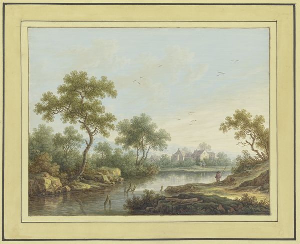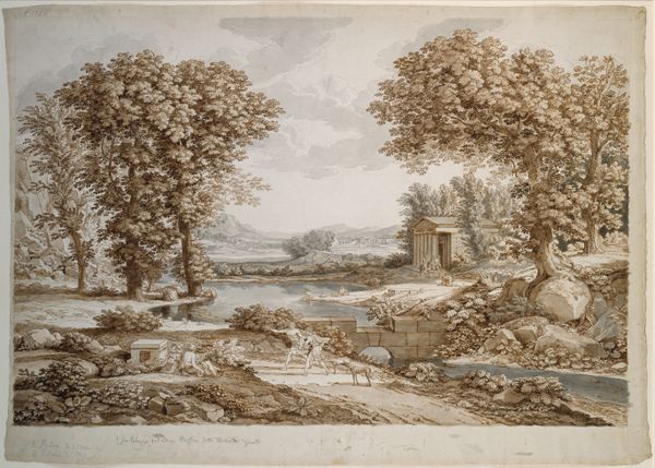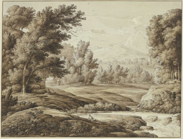 Johann Christian Reinhart created this landscape using pen and brown ink with watercolor. The sepia tones create a harmonious and idyllic scene, where nature and classical motifs blend seamlessly, evoking a sense of nostalgia. Reinhart employs a structured composition, using trees as framing devices on either side, which direct the viewer's gaze towards the tranquil lake and distant mountains. Classical elements, such as the figures, temple, and carefully placed ruins, function as signs that romanticize the past, inviting a reflection on history. The subdued color palette works to unify the various elements, reinforcing a contemplative mood. This isn't just a representation of nature; it’s a carefully constructed landscape imbued with cultural codes and meanings. Through its balanced composition, Reinhart's "Heroic Landscape" becomes a pictorial essay that invites contemplation of our relationship to nature and history.