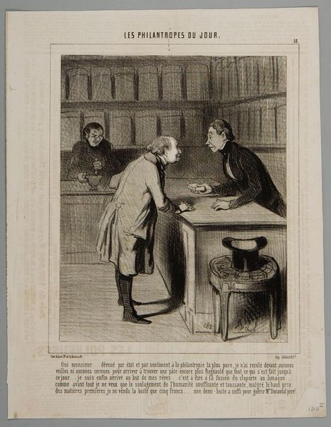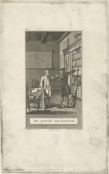 This anonymous print, titled "Auteur biedt een boekhandelaar zijn manuscript aan," presents an author offering his manuscript to a bookseller. The scene is set in a bookshop, likely in France, given the French inscription, during a period when the print medium was a dominant force in shaping public opinion and cultural values. The image creates meaning through the visual codes of dress and setting, referencing the social hierarchy of the time. The author, in a somewhat shabby coat, offers his work, while the bookseller, more formally dressed, seems skeptical. This interaction reflects the changing role of the author in society and the increasing commercialization of literary production. The print may critique the power dynamics within the literary marketplace. An art historian might investigate this image through archival research into the publishing industry of the time, considering the economics of authorship, the role of literary salons, and the evolving status of writers in society. Studying this print allows us to reflect on the social conditions that shape artistic production and how art can comment on the structures of its time.