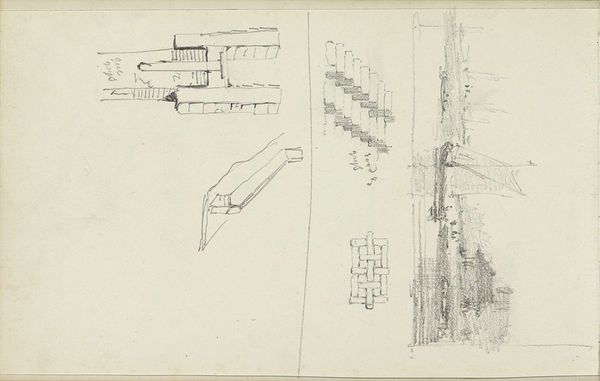 Curator: This delicate pen drawing offers us "A View of a Row of Houses in Oudewater" by Adrianus Eversen, estimated to have been created sometime between 1828 and 1897. It's a fleeting cityscape captured with the barest of lines. Editor: It’s lovely in its incompleteness. It feels like a memory fading at the edges. Look at how some of the lines barely commit to forming anything solid, almost ghostly. The windows seem to float. Curator: The pen-and-ink medium lends itself to this effect. It speaks to the immediacy of the artistic gesture, suggesting an impression captured en plein air. It’s a candid glimpse of daily life rendered without idealization. These were functional houses. Editor: Absolutely, there's no attempt at grandiosity here. But what I love is how Eversen manages to convey the subtle irregularities of lived-in spaces. See that slight sag in the roofline? It gives the whole composition such a relaxed, unassuming character. Curator: Such nuances certainly invite contemplation on architectural permanence versus lived experience. Cityscapes are not merely stone and mortar. Over time, a row of houses becomes a repository of collective memories, shaping identities and fostering social cohesion. Look closely—Eversen wasn’t just documenting structures; he was sketching a community. Editor: That makes me think, what kind of stories do those walls hold? What dramas unfolded behind those lightly sketched windows? This modest drawing becomes a stage for our own imaginings. Curator: Indeed, its starkness is strangely inviting. And notice, despite the simplicity, the use of perspective subtly suggests depth and invites our eyes into the scene. Each line becomes a signifier, a pathway to engage with the world of Oudewater and its place within Dutch society. Editor: It almost compels us to finish the drawing ourselves, doesn't it? It's like a collaboration across time, a quiet invitation into the creative process. It sparks joy. Curator: A delicate reminder of the hidden depths contained within the ordinary, offering quiet respite. Editor: And now, it's even more alive by virtue of having shared what’s visible and what can't be.
