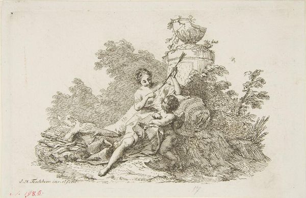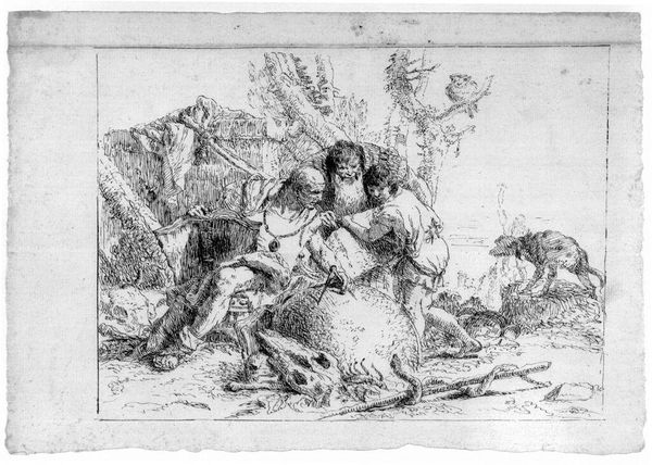 Editor: This is an intriguing etching, "Two Magicians and Two Children," created by an anonymous artist. The swirling lines and ambiguous subject matter give it a slightly unsettling feel. What do you make of it? Curator: Look closely at the lines. See how they build up the forms, creating a sense of depth and shadow. The physical act of etching, the labor involved in creating this image, speaks to a specific time and place. What kind of tools and materials were available to make this? And who could afford to commission or buy such a print? Editor: So, thinking about the materials and the process helps us understand its social context? Curator: Precisely! The availability and cost of paper, ink, and the etcher's skill all reflect the socio-economic conditions that made this artwork possible. Consider the labor involved, both physical and intellectual. That affects its meaning. Editor: That’s a great way to think about art!