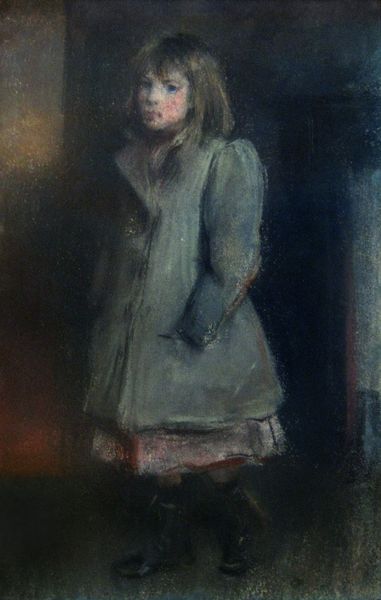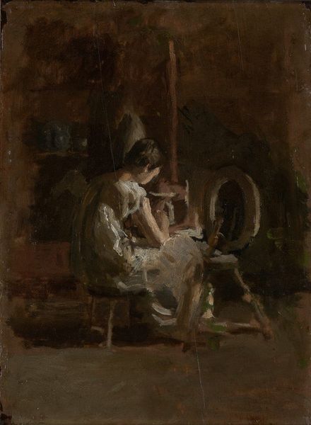 Curator: What a haunting piece! It feels like a memory barely held together. The colors, so muted, they hum a quiet, almost melancholic tune. Editor: That’s "By the Fireplace," painted in 1864 by Giuseppe de Nittis using oil paints. The work depicts an intimate scene within a domestic interior, exemplifying 19th-century genre painting, really offering us a look into everyday life. Curator: Everyday life seen through a veil, perhaps. Look at the light falling on her face. It isn't celebratory, it's probing, revealing the creases, the quiet stoicism. And what’s she holding, a knitting needle? She seems to be examining it... almost accusatorily? Editor: Perhaps it speaks to the social status of women in that era? Confined to the domestic sphere, their lives were often centered around tasks like needlework. This seemingly mundane activity becomes significant, it could signify boredom, expectation, and even resistance. Curator: Resistance, I like that! There’s definitely a silent dialogue happening here. The dark corners of the room press in on her, while the faint beam of light feels… judgmental? Or is it hopeful? Editor: I think it's also a representation of artistic shifts during the period. While embracing realism in its subject matter, de Nittis clearly adds his subjective interpretation, pushing past pure representation into something more layered. We begin to see modern anxieties reflected through common experiences. Curator: The background melts away almost like an apparition. The colors do help draw me into the inner world, don’t they? It makes the woman less of a symbol, and more a presence. The overall visual effect transcends historical document. Editor: Exactly. And placing her next to that dark and somewhat mysterious opening… presumably the fireplace... emphasizes both comfort and entrapment, hinting at those broader themes but maintaining focus on her internal reflection. Curator: I feel a deep well of emotion emanating from her stillness. Something unspoken and possibly unspeakable. That, for me, is the mark of truly impactful art. Editor: For me, it is in its historical context: De Nittis presents not just an image, but an engagement with social and political reality using an intimate personal style that invites debate on these historical factors still reflected today. Curator: Art should evoke not only what exists, but perhaps more what could exist. De Nittis challenges with a piece I believe asks its viewers more than it tells them. Editor: Art can serve both purposes. "By the Fireplace," with its technical simplicity and expressive potential, opens many portals for both feeling and inquiry.