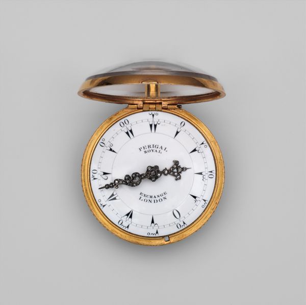 Curator: Our attention is drawn to a stunning Neoclassical still life dating from around 1800, simply titled "Watch" and signed by Chevalier et Cochet. It's crafted from metal, captured beautifully in this photograph. What's your initial take on this piece? Editor: I'm immediately struck by the clock's inherent geometry – that gleaming circle of the frame, punctuated by the strict lines of the numerals. It exudes a very poised sense of order and refined luxury. Curator: Absolutely. If we look at it through the lens of material production, think about the labour involved. Metalwork of this quality demands specialized skills. Who were Chevalier et Cochet? Were they independent artisans, or a workshop reliant on many hands? The rise of the clock industry and division of labor are embedded within such an object. Editor: A compelling point! Yet, notice how the light catches the gold, defining the form with incredible precision. The artist manipulates tone to create subtle variations across the surface of the metal, heightening its elegance. It's an excellent visual balance – that weight of gold balanced by the openness of the watch face. Curator: Agreed. And consider this "still life photography" as a documentation practice. Why this level of detail of documenting material objects? It says something about how the Enlightenment-era obsession with cataloguing and understanding every object from nature to artisan work. It's all intertwined with the watch's functionality as well – a tool to order and measure labour, for time management, that trickles from above. Editor: That connects so neatly with the semiotics of the time. The watch in isolation isn't simply decorative – time and measurement in themselves have this historical power to command social activity and behaviors. To document that as an emblem seems incredibly prescient. Curator: It does. And through exploring the techniques, materials and production processes surrounding this seemingly straightforward object, we uncover a deeper, richer portrait. It becomes an allegory of labor. Editor: Ultimately, the watch reflects the interplay between art and functionality. Looking deeper reveals a wealth of cultural and philosophical layers!
