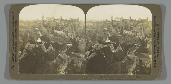 Curator: Let’s turn our attention to this striking vista, “Panorama op de Sint-Janskerk in Luik,” a gelatin silver print captured sometime in the 1860s. Editor: Immediately, I’m drawn to the stark, almost sepia-toned rendering of this cityscape, dominated by the powerful spire and dome. There’s a beautiful feeling of a lost time. Curator: Indeed. The vantage point is key; it invites a top-down reflection upon the social structure embedded in urban spaces during that era, positioning the church literally and symbolically above the masses. The growth of photography aligned with intense debates about social change, visibility, and representation. This shot makes me think about power, control, surveillance, and the photographer’s role in those systems. Editor: Absolutely, the symbolism inherent in the central placement of the Sint-Janskerk, emphasizes its enduring cultural weight amidst burgeoning urban expansion. The photograph evokes visual traditions harking back to illuminated manuscripts or even medieval tapestries. One sees here, very clearly, cultural continuity, and visual echo across diverse mediums. Curator: It also complicates things – that supposed continuity masked the lived realities of an era increasingly shaped by rapid industrialization and inequality, which may or may not have been fully understood by whoever created this artwork. But it makes me consider who was excluded in making such images and from deciding the norms that went along with those images. Editor: That's a critical point. Looking at this piece through a psycho-geographic lens, I can sense how urban environments like Liege became both theaters of progress and palimpsests of historical symbols – especially here with this religious structure overseeing every domestic activity under its protection. This tension makes the artwork all the more resonant. Curator: Thank you; your readings add critical texture to my own contextual examination, allowing us both a better view to understanding these intricate layers within what might at first seem like a simple photographic document. Editor: Yes, thinking across historical and symbolic frames opens new perspectives not only on what we see but what such sights evoke over decades—across personal memory and history.