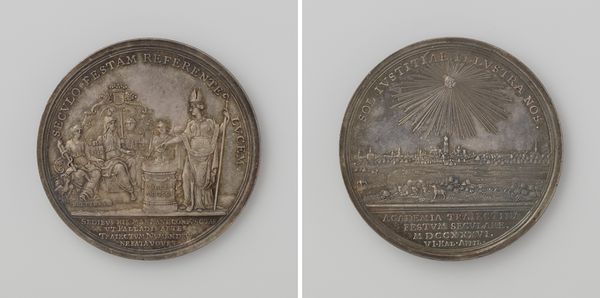 This silver medal by Hendrik Meijer commemorates William V’s inauguration in Utrecht. On one side, four allegorical female figures stand in classical robes, likely representing the unity of the Dutch provinces. One holds a staff with a hat, a symbol of freedom and revolution, echoing motifs from ancient Rome. These figures, with their serene expressions and flowing garments, recall the classical ideals of harmony and civic virtue. Yet, even in this image of unity, the seeds of discord are sown. The staff surmounted by a hat, a symbol adopted during periods of upheaval, resurfaces throughout history, from antiquity to the French Revolution, each time signifying a struggle for liberty, a collective yearning for change etched into the subconscious. Notice how the figures’ linked hands convey a sense of solidarity, yet the very need to emphasize unity suggests an underlying fragility. This medal, intended to celebrate harmony, hints at the ever-present tensions that drive historical change. A potent reminder of how symbols evolve, carrying echoes of past struggles into the present.