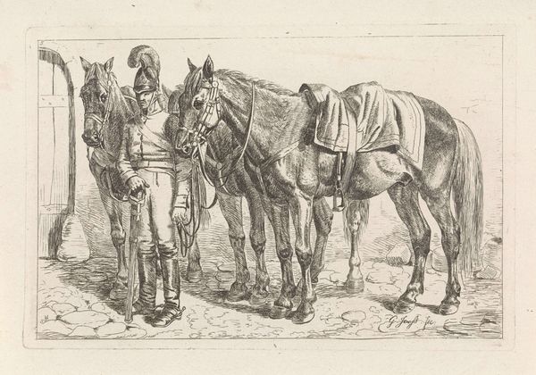 Curator: Here we have "Two Horses in a River Landscape," an etching and engraving created in 1809 by Adam von Bartsch, a significant figure in printmaking history. Editor: My initial impression is one of quietude. The somber monochrome palette contributes to a certain contemplative stillness. Notice the meticulous hatching creating gradations of tone and depth. Curator: Absolutely. The strategic placement of these two equine figures is worth noting. The artist’s play with light and shadow adds dimension, emphasizing the structural forms beneath. It is, after all, a masterful display of value relationships. Editor: Yet those very horses are potent symbols! Consider the horse throughout history, representing power, freedom, nobility...their placement near the river adds another layer. Water symbolizes purification and the passage of time, invoking ideas of temporality. Curator: While the symbolic potential of the imagery cannot be discounted, the pure formalism here is key. Observe the relationship between the textured foreground and the simplified background. Von Bartsch balances detail with areas of negative space. Editor: But even in realism, artists choose their subjects and arrangements with purpose! Aren't these horses also representations of status in 19th century river society? Consider their immaculate saddles, revealing prosperity, their health indicative of care and social standing. Curator: Undeniably. Yet through compositional means and the use of line and form, Von Bartsch provides visual interest, directing the viewer’s attention through varying levels of tonal intensity. Editor: And the viewer is invited to contemplate more than just forms! These animals and their surroundings serve as conduits for societal stories. They embody narratives of labour, travel and ownership woven within that landscape. Curator: A rich demonstration, then, of formal construction meeting cultural encoding in visual format. Thank you for that compelling reading. Editor: An enriching convergence of visual strategy and symbol recognition has opened fresh channels for analysis, so I thank you too!