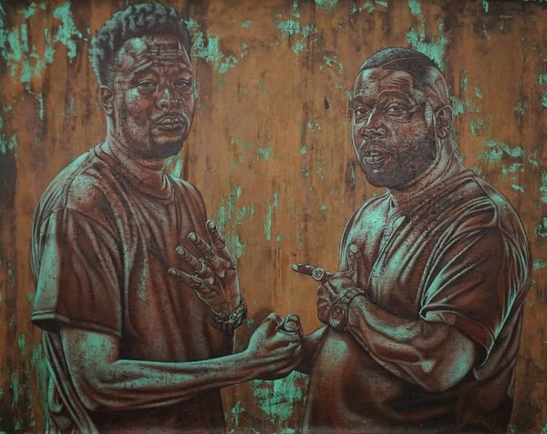 Editor: Alfred Conteh’s portrait, "Sauce," executed in acrylic and oil, presents a striking figure with what looks like a cigarette. There’s a vulnerability in his gaze, but also a quiet strength. What layers do you see beneath the surface, so to speak? Curator: It's crucial to examine this portrait within the context of contemporary representations of Black masculinity. The tattoo, the cigarette, even the exposed skin, are all loaded signifiers. Do you see how the artist uses these elements to both conform to and challenge prevailing stereotypes? The ‘Zone 3’ tattoo could be a reclamation of space, a marker of identity within a system that often seeks to erase it. Editor: That's interesting; I hadn’t considered the spatial element represented by the tattoo. Does Conteh’s technique further inform your interpretation? Curator: Absolutely. Note the almost hyper-realistic depiction of the figure contrasted against the abstract background. This tension between the specific and the ambiguous opens up a space for dialogue about the individual versus the societal forces that shape him. It’s an invitation to consider how identity is both constructed and performed. Consider also the ‘sauce’ of the title - is it the figure or is it about the world he inhabits? Editor: It feels like the artist wants us to really *see* this person, rather than simply categorize him. Curator: Precisely! And in seeing him, to confront our own biases and assumptions. Conteh's work prompts essential questions about visibility, agency, and the ongoing struggle for self-definition within a society still grappling with issues of race and power. Editor: It sounds like ‘Sauce’ encourages not only a close looking but an ethical responsibility. Curator: Indeed. This portrait is a powerful reminder that art can be a catalyst for critical self-reflection and social change.