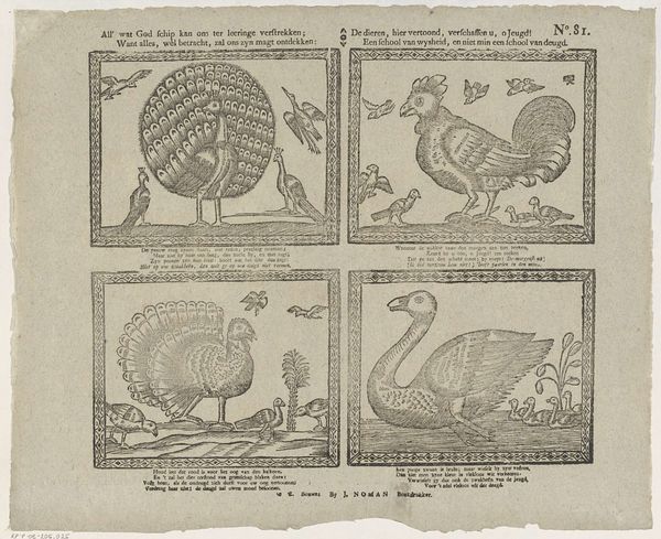 Editor: Today we're looking at "Kinders komt nu maar met hoopen / Om deez vogelen te koopen," a print from between 1831 and 1854 by Erve H. Rynders, housed here at the Rijksmuseum. It reminds me of a children’s book page. How do you interpret this work from a formalist perspective? Curator: Immediately striking is the grid structure. Note how Rynders contains each bird within its own clearly defined rectangular space, further emphasizing the artificiality and constructed nature of the composition. The deliberate, almost mechanical, arrangement draws attention to the relationships between these individual panels. Consider the use of line - primarily functional in defining the shapes of the birds, yet varying in weight to create a sense of depth. Editor: I see the differences in line weight, but I didn't really think about it! Does that influence your interpretation? Curator: It emphasizes certain forms over others. For instance, the heavier lines used to depict the outlines of the birds compared to the more delicate lines indicating background elements, brings forward these specific figures. What does this tell us? The deliberate flatness, a feature of printmaking of that time, does create a sense of stylization. Editor: So it's more about the construction of the images, less about what they mean? Curator: The semiotic interpretation does arise out of those artistic components: the linear quality, the grid... What do these components tell you? How might you decode them in our present time? Editor: That makes me think about how different elements build into the artwork, a totally new approach for me to analyzing art. Curator: Exactly. It’s through this understanding of structure that we begin to truly “see” a work of art.