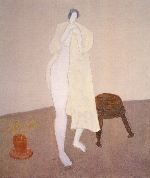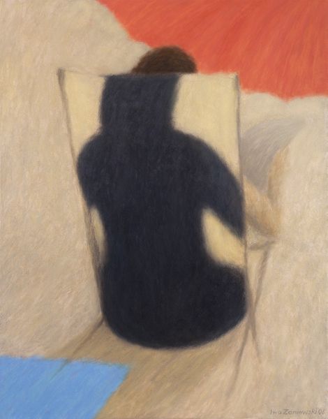 Curator: Standing before us, we have Milton Avery's "Woman with a Hat," rendered in oil paint, created in 1945. It's deceptively simple. Editor: My first impression is a kind of quiet unease. The facelessness is unsettling, but the palette is warm, almost inviting. What's she hiding, or rather, what's being hidden from us? Curator: That facelessness is key, isn't it? Avery often reduced forms to their essence. Consider the era: painted just after World War II, this portrait could be read as a comment on the depersonalization inherent in modern life, in societal expectations of women at the time. It certainly resists easy categorization. Editor: That makes sense. It is a reductive style and very spare. The flatness of the image, paired with that gesture of almost clutching the hat. The hat’s shape obscures identity and adds such drama. And I don’t know what kind of hat this could be. What kind of message does this "hat as shield" communicate? What are some things that may have occurred at that moment for a woman to hold a hat like this? Curator: We can analyze how Avery engaged with and pushed back against prevailing social mores in the New York art scene, against a certain kind of heroic figuration and find interesting contrasts between this quiet form of portraiture, the grand artistic narratives of the period. Avery strips everything away—the face, even—to arrive at some basic, unadorned truth, or an exploration of a person in conflict. Editor: Perhaps "basic" isn’t the right word. There is an undeniable, powerful message coming from a female artist regarding anonymity, the impact of society, and gender inequality. The woman herself may be hidden by a hat, but I, for one, am looking more closely. Curator: Right, and the "shielding" of identity that’s still relevant today. Maybe a way of protecting oneself. Editor: That quietness you mentioned isn’t necessarily weakness. Curator: Indeed, and it's a reminder to resist assumptions based on prevailing historical art narratives and what’s deemed most valuable at any one time. What an invitation, even now.