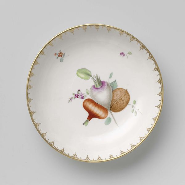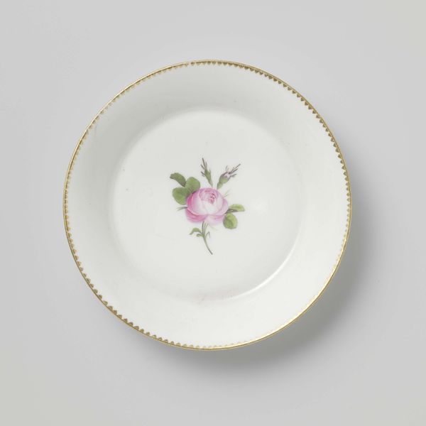 This delicate dish, painted by Loosdrecht, presents a pastoral scene with poultry in a landscape. The composition centers around a hen perched atop a rustic fence, rendered in soft, naturalistic tones against the stark white porcelain. The artist's formal arrangement of elements creates a subtle tension between the detailed rendering of the central motif and the sparse scattering of floral details around the rim. This tension destabilizes traditional notions of pictorial space, inviting contemplation on the interplay between representation and abstraction. Consider how the carefully chosen palette of muted browns and greens interacts with the reflective surface of the porcelain, subtly disrupting our perception. Ultimately, the dish serves not merely as a functional object but as a canvas for exploring the relationship between art, craft, and the everyday. It challenges fixed notions of hierarchy, inviting us to reconsider the aesthetic potential inherent in the simplest of forms.