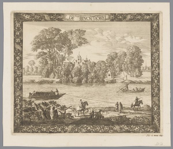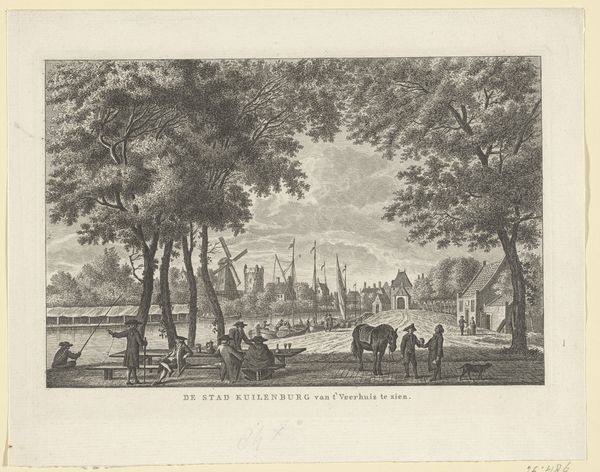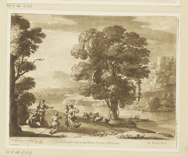 Curator: Ah, "Landscape with cattle and a ferry on a river," dating possibly to 1774. It’s a print, an etching, by Richard Earlom, currently held at the Rijksmuseum. Editor: My first thought? The pervasive sepia tone lends it such a placid, almost nostalgic air. It is such a highly pastoral scene, all soft lines and subtle shading, despite depicting quite a bit of activity. Curator: Indeed. Earlom really captured the light. Notice how the etches create texture, especially in the foliage and water. The eye is led from the dark foreground up toward the brighter, undefined background with gentle changes in shading. Consider the composition. How would you analyze the deployment of form within the visual space? Editor: The way Earlom uses everyday life as his focus, I'm interested in the public function this imagery served back then. This almost presents an idyllic, ordered, commercial interaction. How does the politics of this genre in that period compare to those in landscapes and genre works throughout history? Curator: The balanced forms suggest a kind of Arcadian harmony; a common enough pastoral theme. The interplay of light and shadow guides your vision to these points. He contrasts rough textures in the foreground, the farm animals and figures, with the water mill in the background, for example, suggesting different realms of activity that nonetheless integrate. Editor: Perhaps. I see less harmony and more… normalization. Consider this work’s place and date of origin: just before revolutionary movements redefined the social landscape in both America and France. Earlom idealizes not harmony but specifically, existing class roles at this precipice of profound social transformation. The working class and aristocracy, the farm animals and the distant mountains—each is literally in its place. Curator: That tension of idyllic nature, labor, and latent political undertones complicates the work further. His skillful manipulation of light directs you toward his subjects while carefully maintaining each elements’ place in the tableau. Editor: Yes, and it strikes me that this "simple scene" offers a potent visualization of the prevailing socio-political attitude. Thank you, this gives me further thoughts. Curator: The discussion around its function only elevates its artistic complexity further for me.