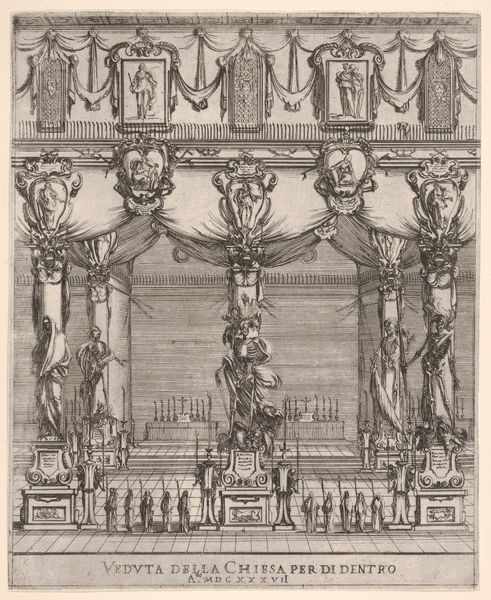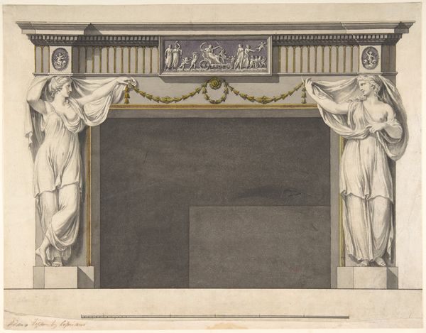 Curator: Our attention is drawn today to Giovanni Battista Piranesi's etching and engraving, a chimneypiece design dating from 1764 to 1774. Part of his "Diverse Maniere" series. Editor: It feels monumental, even in two dimensions. The stark contrast of the etching gives it an imposing quality. Look at the assertive geometry, offset against that deep shadow suggesting the void of the fireplace. Curator: Indeed. Note how Piranesi uses line—clean, precise lines that articulate the various planes and levels of relief. He’s masterfully deployed a visual language that evokes depth and sculptural form on a flat surface. The rhythmic repetition of the geometric patterns provides structure. Editor: And culturally, it's all referencing back to this Roman ideal. Winged victories, trophies of war… symbols intended to broadcast power and sophistication. Every motif feels carefully chosen to create an environment steeped in imperial glory and maybe even opulence. Curator: Precisely. The composition itself invites decoding, too. The cornucopias, traditional symbols of abundance and nourishment, flank the jambs, while the lintel presents us with a scene of martial triumph. These elements balance the entire composition perfectly. The organization highlights these important symbolic relationships. Editor: And let’s consider the context. Piranesi was deeply engaged with the architectural vocabulary of antiquity. This design isn’t just a decorative plan. It's a statement about the continuity of cultural authority. Even that small figure battling on a griffin is saying something—a constant power struggle and a new kind of cultural warfare. Curator: His obsessive interest in the past and the grandeur of Rome comes through in these dense graphic works. Piranesi almost reconstructs and elevates what has already passed into a myth. It transcends function and exists for us to meditate on. Editor: Looking again, I find that contrast especially haunting. It underscores a sort of emotional chill. The very architecture looms with a promise of dominance and cultural force. Curator: Agreed, this design displays a keen architectural wit. Editor: It's definitely something to think about next time you build a fire!
