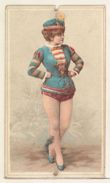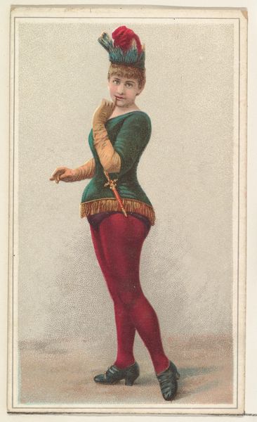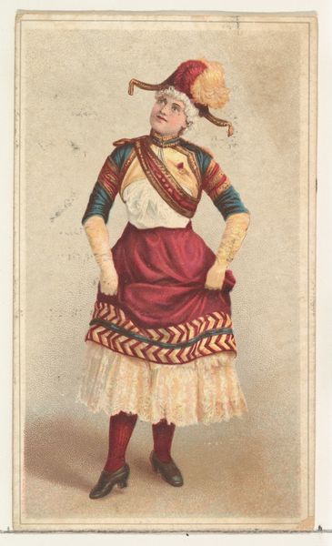 Editor: Let’s take a look at "Actress wearing costume with sword and tri-cornered hat," a print made around 1891 by W. Duke, Sons & Co. You know, I find it kind of theatrical, but almost in a flat, cardboard cutout way. It's striking, but also feels a little…stiff? What do you make of it? Curator: Oh, it's a delightful little drama frozen in time! Think about what these trade cards were – pure marketing magic. Tobacco companies wanted something eye-catching, memorable. And what’s more exciting than the theater? I imagine a flurry of plumes, the swish of the sword... perhaps an early iteration of what we call a cosplay photograph? Does it inspire any narratives or connections? Editor: Hmmm, maybe it does. I see her more as an archetype rather than a character...almost as if she isn't necessarily meant to be "real," but she could be representative of women gaining some empowerment in the late 19th century. Are there clues within the card itself? Curator: Absolutely! The very presence of an actress in costume indicates a blurring of reality and artifice – her identity is intentionally constructed for a viewing public. What do you make of the sword? Of the fact that a tobacco company uses *this* to get more sales? Editor: Okay, I didn’t really notice before. But why her costume? This isn’t just ANY old costume – it's suggesting she's playing a traditionally male role, like a dashing pirate or cavalier. I'm surprised they sold cigarettes by advertising female power like that. Curator: See? Trade cards offer delicious social commentaries, miniature history lessons hiding in plain sight! It seems they also captured—and catered—to a new woman taking center stage in the 1890s. This image and that concept work really well to change how I saw this work. Thanks! Editor: Absolutely. A great piece – simple, but actually a fascinating snapshot of late 19th-century popular culture!
