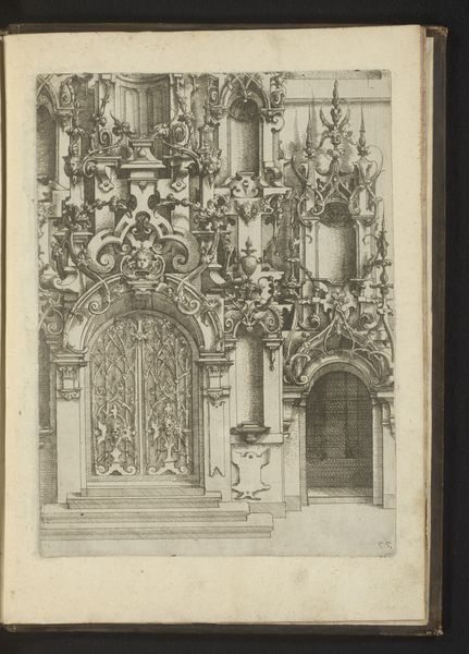 Curator: Just look at this! What do you see, walking up to this intricate design? Editor: An operatic dream of enclosure. It's imposing, detailed, yet ultimately a barrier. The heavy linework and the way it’s captured reminds me of a fever dream, that dizzying space between sleep and waking. Curator: Precisely. We're gazing upon a piece by Wendel Dietterlin, an engraving created between 1593 and 1595 titled “Portaal met ijzeren hek geflankeerd door kariatiden” or Portal with an iron gate flanked by caryatids. It showcases his unmistakable Mannerist style. Editor: Mannerist, indeed. The caryatids—female figures serving as architectural supports—feel almost strained under the weight of the structure, don't they? This really emphasizes the idea of women bearing societal burdens, quite literally holding up the gate and all its implications. I'm wondering if that was a deliberate artistic statement or if it simply speaks to our current moment? Curator: Well, Dietterlin's Mannerism played with exaggerated forms and spatial distortion to create a sense of unease, so that interpretation resonates beautifully. The detail, crafted with pen and ink, evokes grandeur, while those figures and ornamental ironwork also hint at exclusion and controlled access. Maybe all things that glitter aren't gold! Editor: Absolutely. The gate itself, so meticulously rendered, feels like a symbol of denied passage as much as an invitation. Who is kept out, and why? This portal screams hierarchy. And you have all these chubby putti hanging up above, like it is teasing those down below. Curator: The artist was obsessed with architecture, and this print reveals how he combined its elements to express philosophical, even esoteric, ideas about society, the world, and the human form. His vision was over the top, for sure, and it's thought to be intended to spark controversy! Editor: Mission accomplished, I’d say! It definitely evokes a dialogue, a tension between beauty and oppression that’s still relevant centuries later. It's an entry point not into a building, but a discussion. Curator: For me, its lasting appeal rests in Dietterlin's capacity to build up spaces which ask questions, offering us passage into speculation of how we think about power and beauty today.