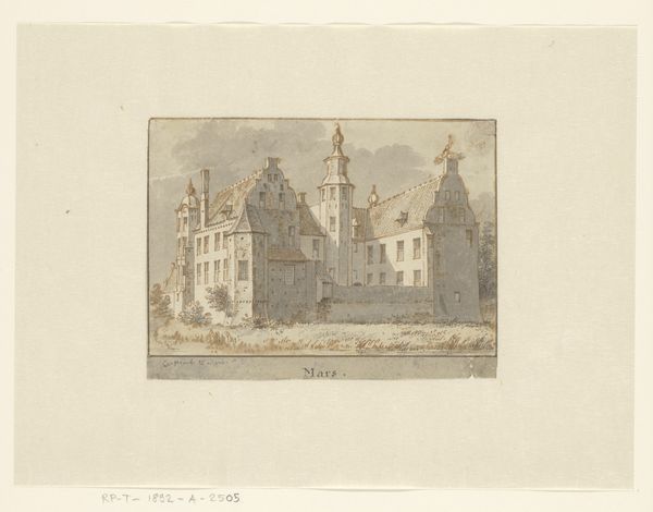 Editor: Here we have Paulus Lauters' "Gezicht op het stadhuis van Haarlem," dating somewhere between 1827 and 1875. It's a drawing in ink on paper, depicting a cityscape. The detail is incredible. What do you see in this piece, especially regarding its materials? Curator: For me, the intrigue lies in the conscious choice of ink and paper to portray this municipal building. Consider the Industrial Revolution, a period where these materials became more accessible due to technological advances in paper production and ink manufacturing. Does the artist consciously or unconsciously engage with emergent consumer culture? Editor: That’s a really interesting point. I hadn’t thought about the industrial implications. Curator: Yes, Lauters depicts Haarlem's town hall, a civic structure representing governance, made with relatively available, repeatable material. Could it signify a democratization of art production or consumption in line with changing social conditions of labor in that era? Editor: So the drawing, its materials and how the work would reach the masses, mirrors some social shifts occurring then. Curator: Precisely. Realism, of course, directs us towards specific depictions. But the *making of* this image reflects broader manufacturing and economic realities. Consider the sheer availability of paper compared to previous eras. The lines become blurred between art, craft and mass-production, forcing us to question what 'art' even signifies in such an industrialized world. Editor: Wow, I never considered that drawing ink on paper could be such a powerful statement. Curator: The medium *is* the message, as they say. Considering art through a material lens shows its direct relationship to social, industrial and consumer behaviors. Editor: Thanks for sharing your expertise! Curator: A pleasure. Analyzing production makes for an enriched appreciation!