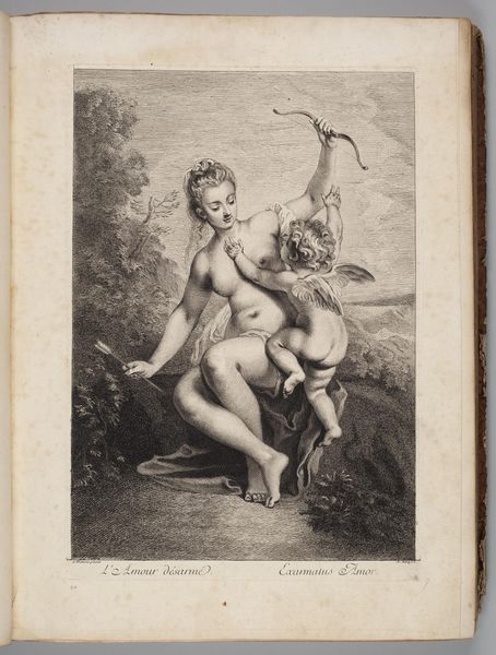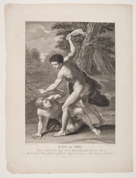 Curator: This is J.F. Clemens's 1780 engraving, "Illustration til Johannes Ewalds 'Adam og Eva' III," which translates to Illustration for Johannes Ewald’s "Adam and Eve" III. What are your initial impressions? Editor: The figures seem strangely weightless, almost floating in this classical landscape. The stark contrast between light and shadow gives it a rather theatrical, dramatic feel, don't you think? Curator: Absolutely. It's worth considering the historical context of this piece. Clemens created it during the Enlightenment, a period defined by reason and a return to classical ideals, so this scene from the Bible gets filtered through those ideas. Editor: True, one sees it clearly in the carefully rendered bodies, attempting an almost sculptural presence in print. The meticulous use of line and texture contributes to that three-dimensional illusion, even though it is a two-dimensional medium. Semiotically, the varying thickness and density in each line produces its own form of tonal value. Curator: And look at how Eve is actively reaching for the fruit while Adam seems caught between desire and hesitation, his body literally caught in mid-stride. That dynamism really embodies the moment of choice and its implications, and reflects the era’s philosophical shift towards free will, yet, it reinforces traditional gender roles that frame the dynamics of decision-making. Editor: I see it less as reinforcing roles and more as establishing an ethical conflict using carefully chosen visual tools. The forbidden fruit glows with promise through the light. Her upright posture suggests confidence—though with potential consequences rippling through her very being—which contrast vividly with the almost frantic desperation implied by Adam's movement. The twisting form of the serpent lurking at the tree’s trunk cannot go without mention; there is something quietly masterful at play within those textures alone. Curator: An important nuance to point out as well is how the figuration echoes throughout art history and its continuing themes concerning gender and power, which continue to be interrogated in art to this day. It shows how art from the past informs contemporary socio-political concerns. Editor: A persuasive reading, indeed. Analyzing form reveals so much. Curator: Understanding form in relationship to the historical contexts reveals still more. Editor: A compelling dialogue to consider regarding its place in both art and the grand scheme of philosophy.