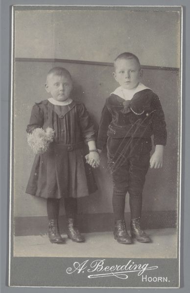Albert Greiner took this studio portrait of two children sometime in the 19th century. The sitters, likely sisters, are formally posed on a small table-like structure, embodying the conventions of studio portraiture that catered to the bourgeois desire for representation and social visibility. Notice the details of their clothing; the lace collars, decorative necklaces, and striped stockings which speak to the era’s emphasis on decorum and the visual coding of childhood innocence. Yet, there is also something unsettling in the children’s expressions. Their gazes, directed at the viewer, lack the animation one might expect. This somberness hints at the high expectations and constraints placed upon children, particularly girls, during this period. The doll held by the younger child, a common prop in such portraits, serves as a symbol of domesticity and future maternal roles, subtly reinforcing the gendered expectations of the time. This photograph is not merely a record of two young lives but also a reflection of the cultural values.